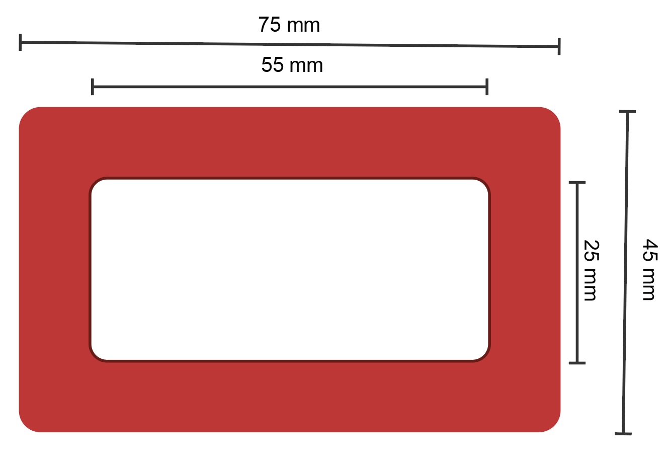They are 75mm wide x 45mm high (3.25mm thickness). The Designable/Printable Area is 55mm x 25mm.